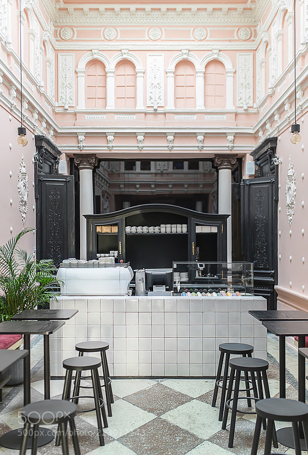 Tiled white rack with coffee machines and cakes in the antique restaurant with white stucco molding on the pink walls. There are black tables and stools, plant, dark wooden sideboard with cups, lamps. via http://500px.com/photo/223017143